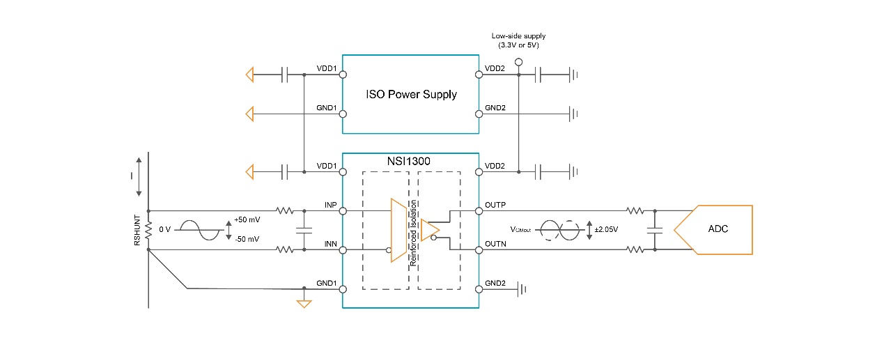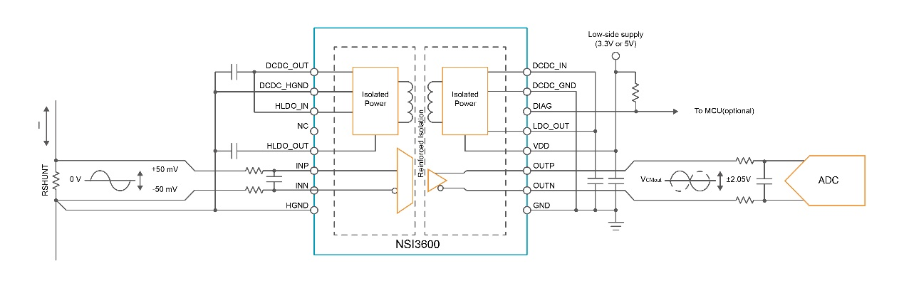 在一些浮地采样的场景下,使用上一代产品NSI13xx系列的客户需要额外设计隔离电源给高压侧供电,而NSI36xx全系列产品均集成了隔离DC-DC电源,这一设计为客户带来了显著的实用价值: