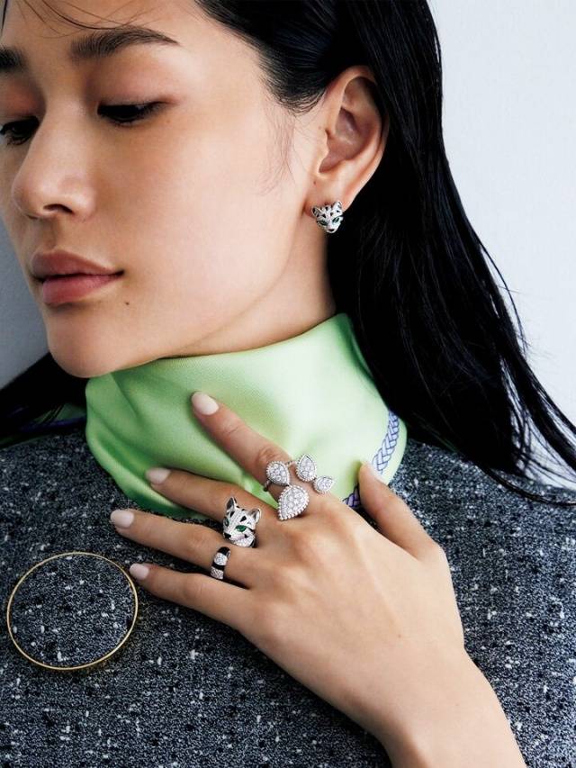 将连衣裙中的黑白色调与围巾的绿色巧妙融合,通过珠宝设计来延续色彩的和谐统一。动物主题的珠宝设计以其独特的冲击力,为整体穿搭增添了一份生动与层次感。珠宝的色彩与服装的搭配相呼应,既能突出高雅气质,又不失个性与趣味。